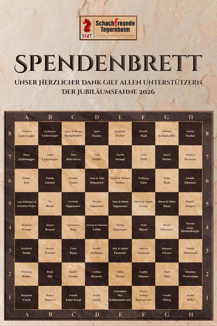 Wir gestalten ein Keilrahmenbild in Form eines großen Schachbretts (8×8 Felder). Jeder Spendende erhält als Dankeschön ein Wunschfeld auf dem der Name gedruckt wird.